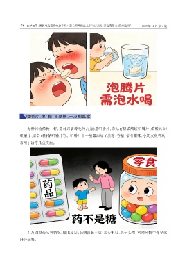 74 白梦如等:碘伏当成糖浆给孩子喝?家长须警惕这几个“坑”,别让家庭药箱变“隐形陷阱”! 2025 年 12 月 第 6 期 咀嚼片:像“糖”不是糖,千万别乱拿 有种药物像糖一样,是可以嚼着吃的,它就是咀嚼片,常见有铝碳酸镁咀嚼片、碳酸钙 D3 咀嚼片、孟鲁司特钠咀嚼片等。咀嚼片中一般都添加了蔗糖、香精,带有甜味,小朋友很喜欢, 常用于治疗儿童疾病。 千万别把药品当糖吃,服用过量,轻则胃肠不适、恶心呕吐、头晕头痛,重则药物中毒导致 肝肾衰竭。