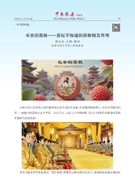 2025 年 12 月 第 6 期 China Pharmacy Online Edition 85 · 医药妙趣 · 长安的荔枝——贵妃不知道的药物相互作用 张从金,王强,郭羽 陆军军医大学第二附属医院 在架空的已经发展出现代医学的大唐天宝四年盛夏,长安城内热浪袭人,兴庆宫内张灯结 彩,一场盛大的荔枝宴正在举行。宴会厅内,文武百官分列两侧,案几上摆着晶莹剔透的荔枝 和琥珀色的荔枝酒。 唐皇李隆基举着荔枝笑道:“诸位爱卿,国泰民安都是你们的功劳,恰逢荔枝监新送到这岭